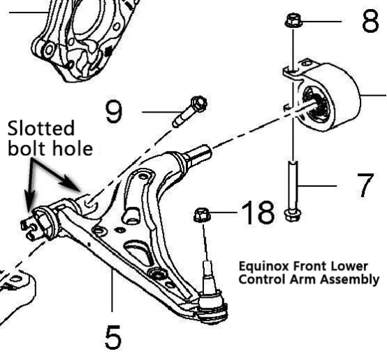 Bildet ovenfor viser den fremre nedre kontrollarmenheten for Chevrolet Equinox. Pilen indikerer hullstrukturen med åpen bolt i bøssingsenheten.
