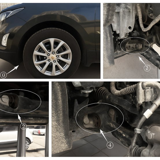 Det forrige settet med bilder illustrerer den strukturelle tilstanden til en feil på en forfjæringskontrollarmbuss på en Chevrolet Equinox. Den anbefaler brukere at, som vist i diagrammet ovenfor, kan den strukturelle komponenten med potensiell svikt inspiseres ved å vri rattet til full lås i posisjon ①. Sikkerhetsverifisering av bøssingsenheten bør utføres gjennom fotografier tatt på flere steder, inkludert posisjonene ②, , og ④.