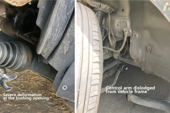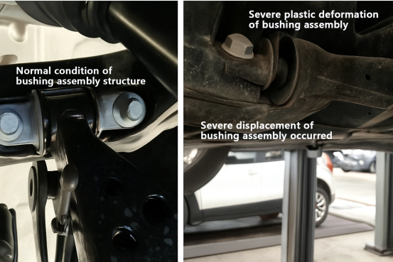 Det gjøres en sammenligning mellom en normalt fungerende styrearmsbøssing (som vist i bildet nederst til venstre) og en defekt bøssing (som vist i bildet nederst til høyre). Han påpeker at ved å sammenligne de venstre og høyre bildene nedenfor, er det lett å observere at gapet i den vanlige kontrollarmbøssingen til venstre er ensartet, og det skal ikke være noen åpenbar bøyning eller deformasjon som vist på det høyre bildet. Hvis et kjøretøy viser tilstanden vist i bildet til høyre, utgjør det allerede en sikkerhetsrisiko under drift.